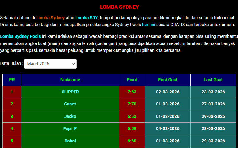 Selamat datang di Lomba Sydney atau Lomba SDY, tempat berkumpulnya para prediktor angka jitu dari seluruh Indonesia! Di sini, kamu bisa berbagi dan mendapatkan prediksi angka Sydney Pools hari ini secara GRATIS dan terbuka untuk umum.